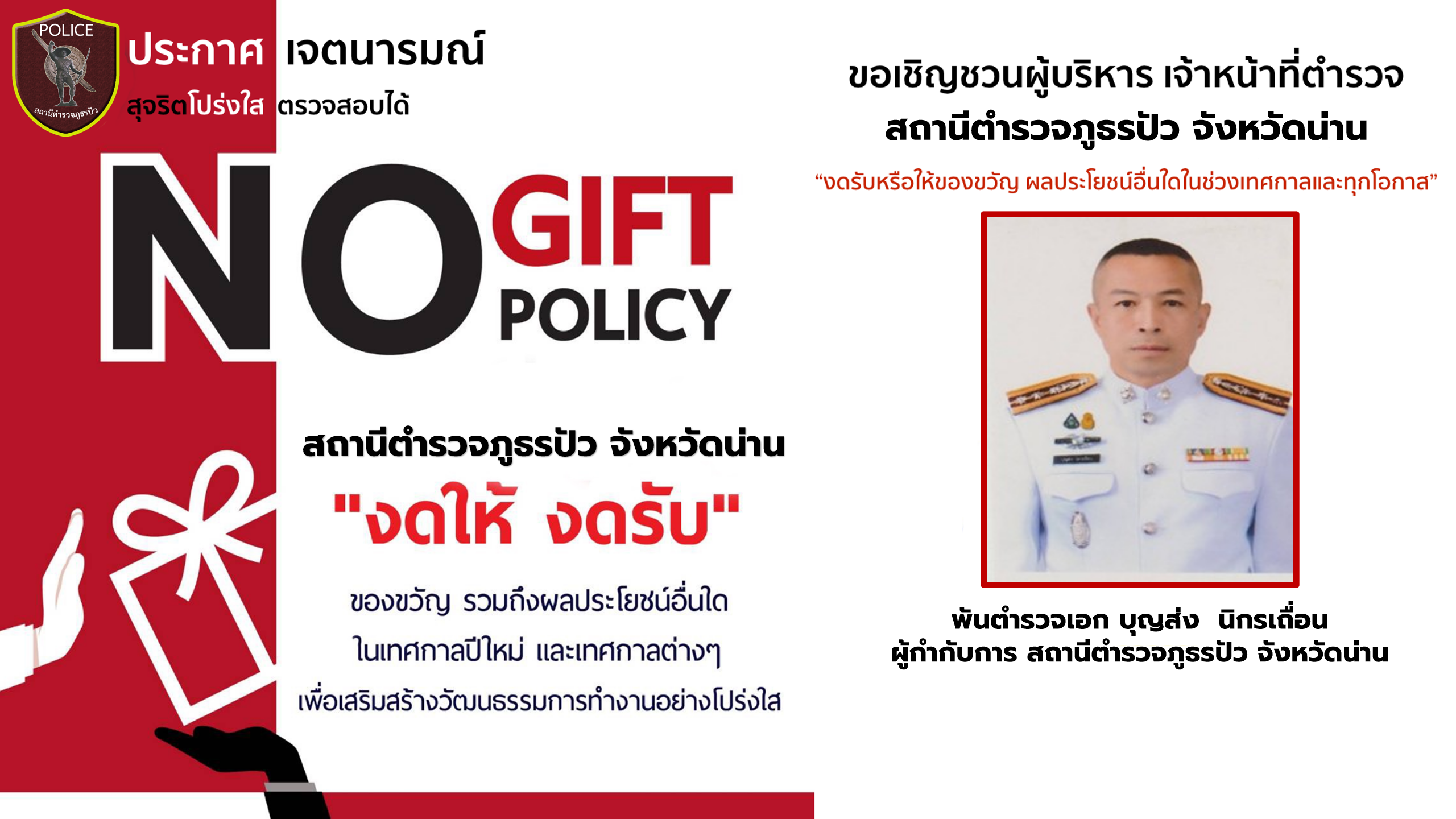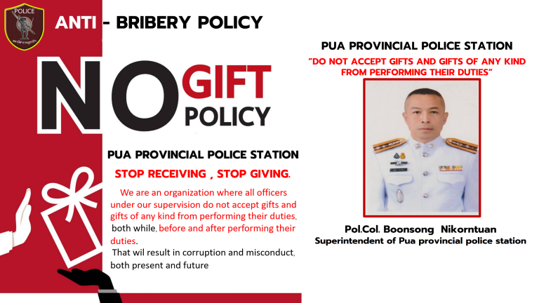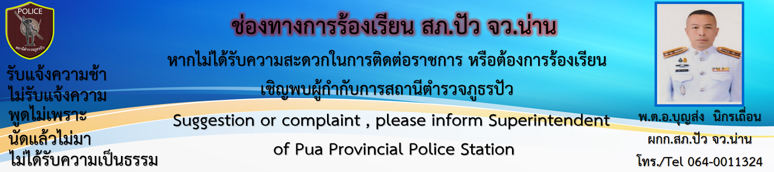 แผนที่ตั้งของ สภ.ปัว จว.น่าน ติดตามได้ที่ Facebook : สภ.ปัว น่าน E - Service บริการออนไลน์ บริการ e-Service อื่นๆ คลิก การประชาสัมพันธ์ข้อมูลผลการดำเนินงานประจำเดือน คลิก เพื่อไปหน้าการประชาสัมพันธ์ข้อมูลผลการดำเนินงานในช่องทางต่างๆ ตุลาคม 2567 พฤศจิกายน 2567 ธันวาคม 2567 มกราคม 2568 กุมภาพันธ์ 2568 มีนาคม 2568 รายงานผลการปฏิบัติราชการประจำเดือน คลิก เพื่อไปหน้ารายงานผลการปฏิบัติราชการประจำเดือน ตุลาคม 2567 พฤศจิกายน 2567 ธันวาคม 2567 มกราคม 2568 กุมภาพันธ์ 2568 มีนาคม 2568 การมีส่วนร่วมของหัวหน้าสถานีตำรวจ คลิก เพื่อไปหน้าการมีส่วนร่วมของหัวหน้าสถานีตำรวจ กิจกรรมที่ 1 หน.สถานีชี้แจงนโยบายต่อต้านการรับสินบน กิจกรรมที่ 2 หน.สถานีตำรวจเผยแพร่ให้ความรู้ สิ่งของหลวง ของกลาง ของบริจาค กิจกรรมที่ 3 หน.สถานีชี้แจง อบรมการเสริมสร้างคุณธรรมจริยธรรมข้าราชการตำรวจ กิจกรรมที่ 4 หน.สถานีประชาสัมพันธ์นโยบายต่อต้านการรับสินบน ไม่รับของขวัญ กิจกรรมที่ 5 หน.สถานีกำชับการปฏิบัติตามนโยบาย
